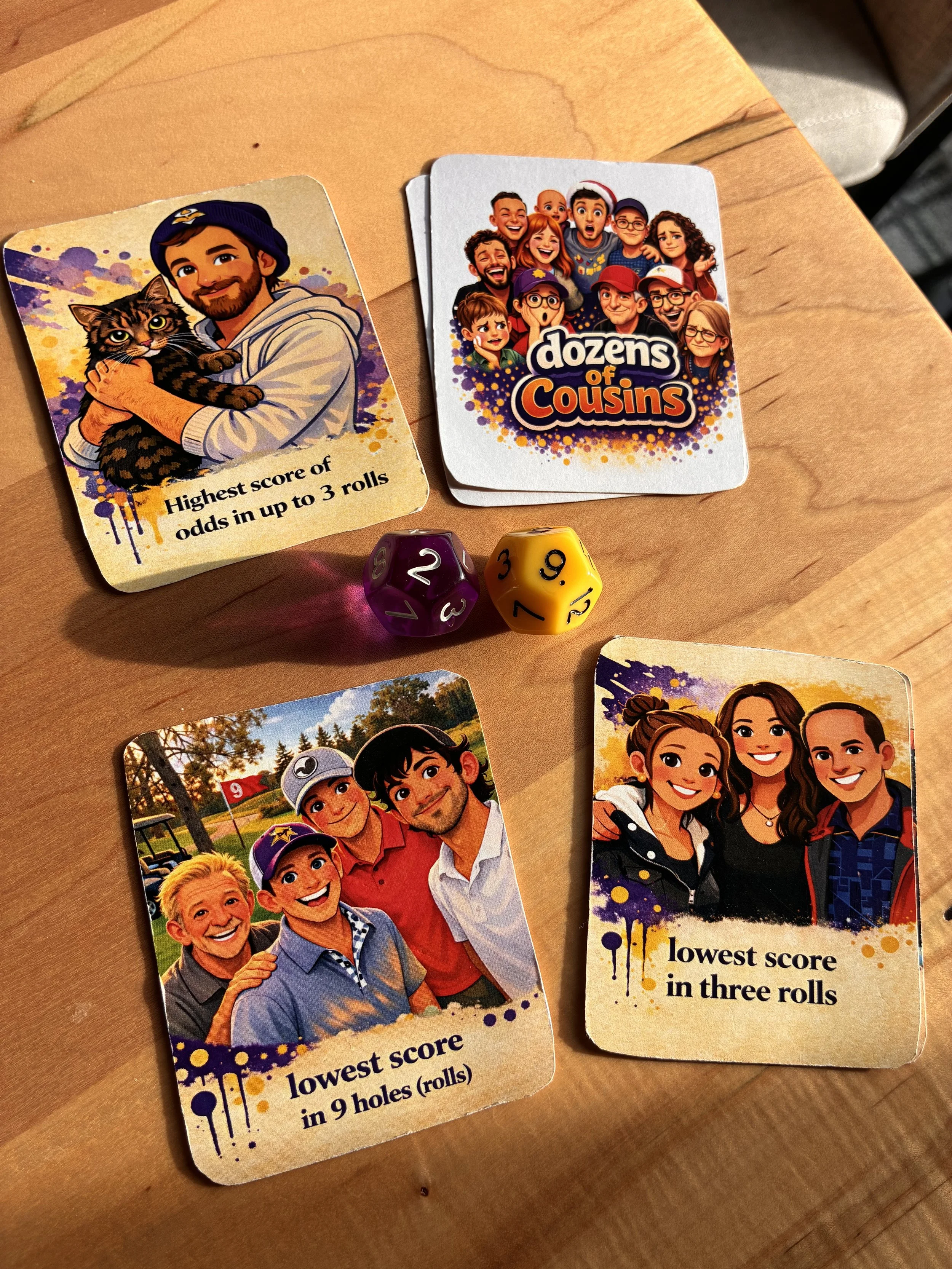 A Yahtzee inspired dice game using custom d12s. No need for a score card! Complete the objective best or first and win the most cards!
